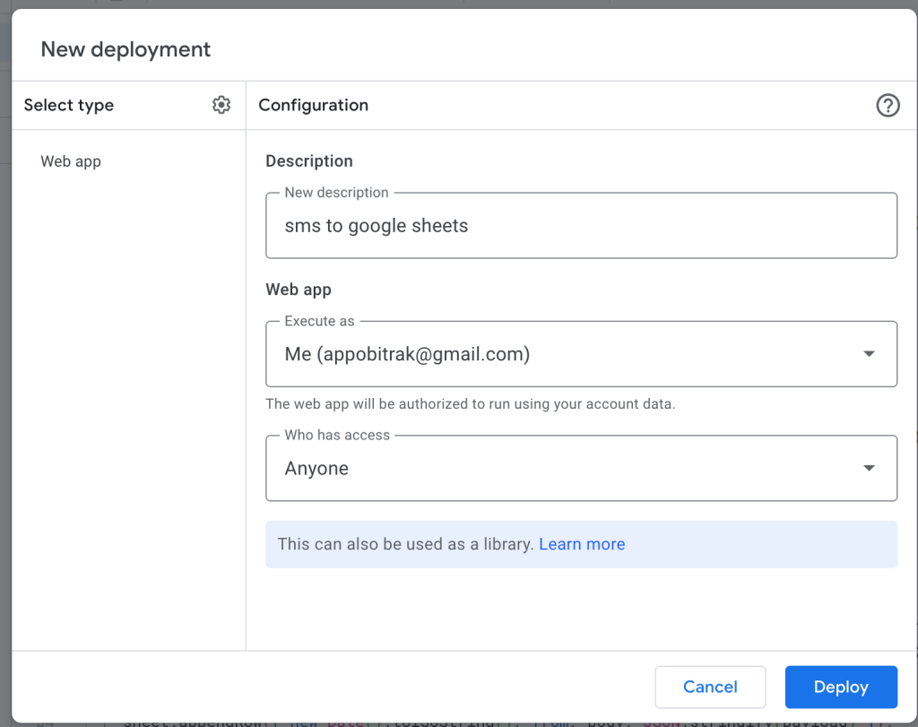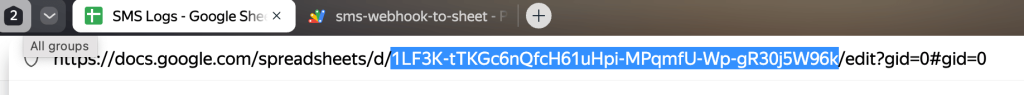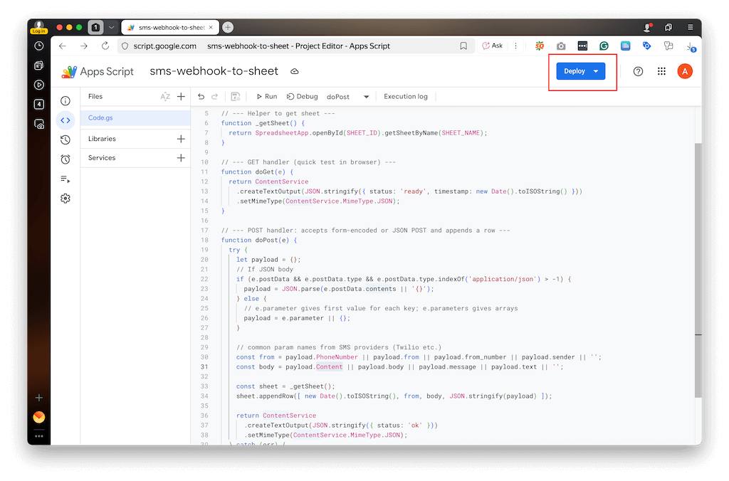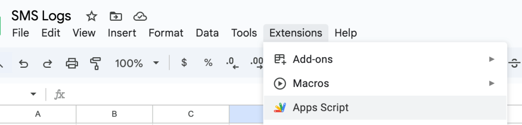 - This opens the Apps Script editor, where we’ll write a small script to receive SMS messages from AutoForwardText and log them in the sheet.