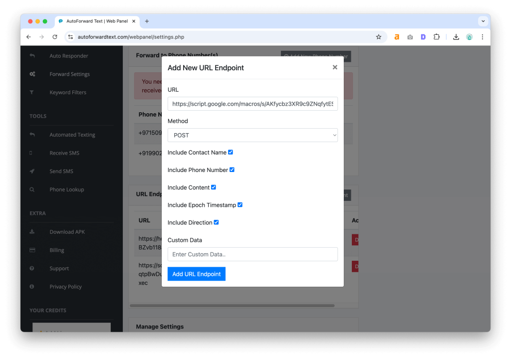 - AutoForwardText is installed on your iPhone or Android phone — this will forward incoming SMS messages to a Google Apps Script endpoint.