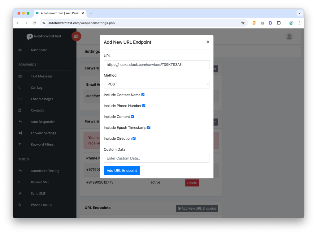- Go back to the AutoForward Text online dashboard and paste the Webhook URL in the “New URL Endpoint” in the Forward Settings.