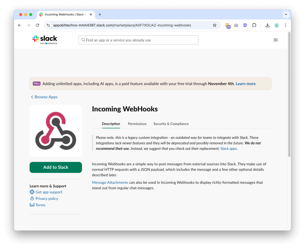 - Search for Incoming Webhooks and click Add to Slack.